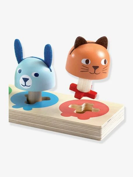 4 animaux colorés à placer dans la base selon la forme de leur pieds. L’enfant observe la forme du pied pour le placer au bon endroit et tourne la tête pour voir le visage face à lui.