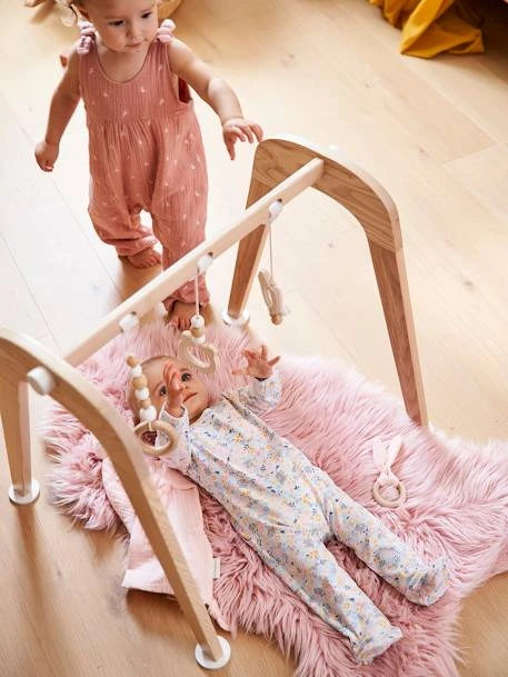 Un jouet d’éveil en bois au design rétro et minimaliste que vous allez adorer placer au milieu du salon ! Posé sur un tapis ou un tapis d’éveil, ce portique modulable émerveillera bébé avec ses adorables jouets. Il est livré avec 3 suspensions en bois qui se fixent par velcro et que vous pouvez facilement ôter pour en placer d’autres. Une très belle idée de cadeau de naissance pour un cadeau très tendance !