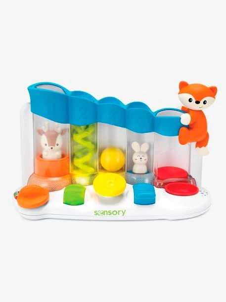 o Suis- moi : la base colorée des tubes s’illumine successivement et de façon aléatoire pour inciter bébé à manipuler les touches et découvrir les sons